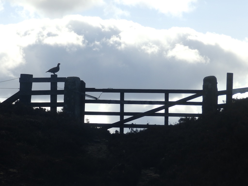 You'll get there eventually after a decent view down to Sikehead Dams, it's thought, and then through a gate with a gracefully posed grouse on it.